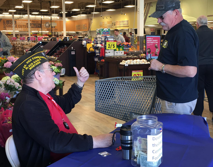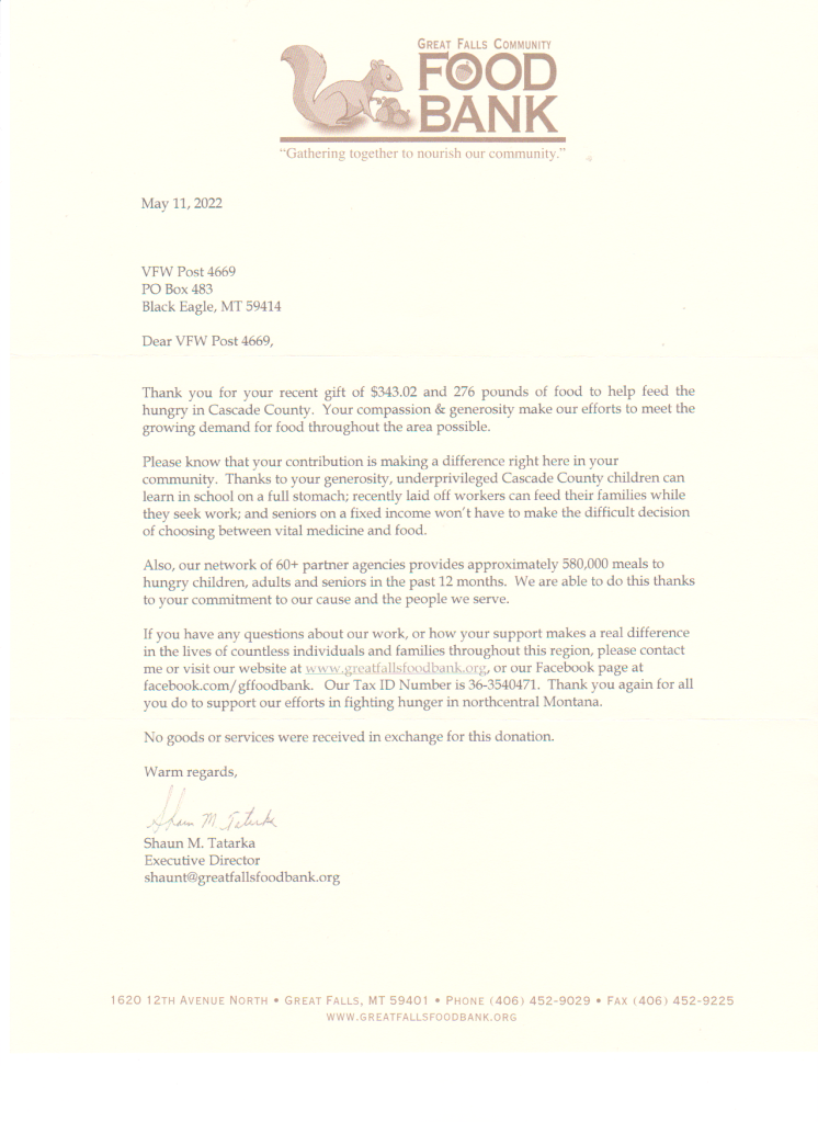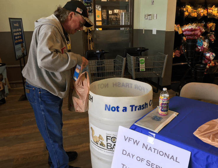 VFW Post 4669 in Black Eagle held a food drive for the Great Falls Community Food Bank for the VFW National Day of Service this weekend. We were set up from 9 am to 2 pm at Smith’s Food & Drug at Marketplace on Friday, May 6th (for the ease of the food bank). We collected $343.02 in cash that went directly to the food bank, and filled almost three barrels with non-perishable food. We were eager to do this since the food bank has been low on stock with so many people needing help lately.