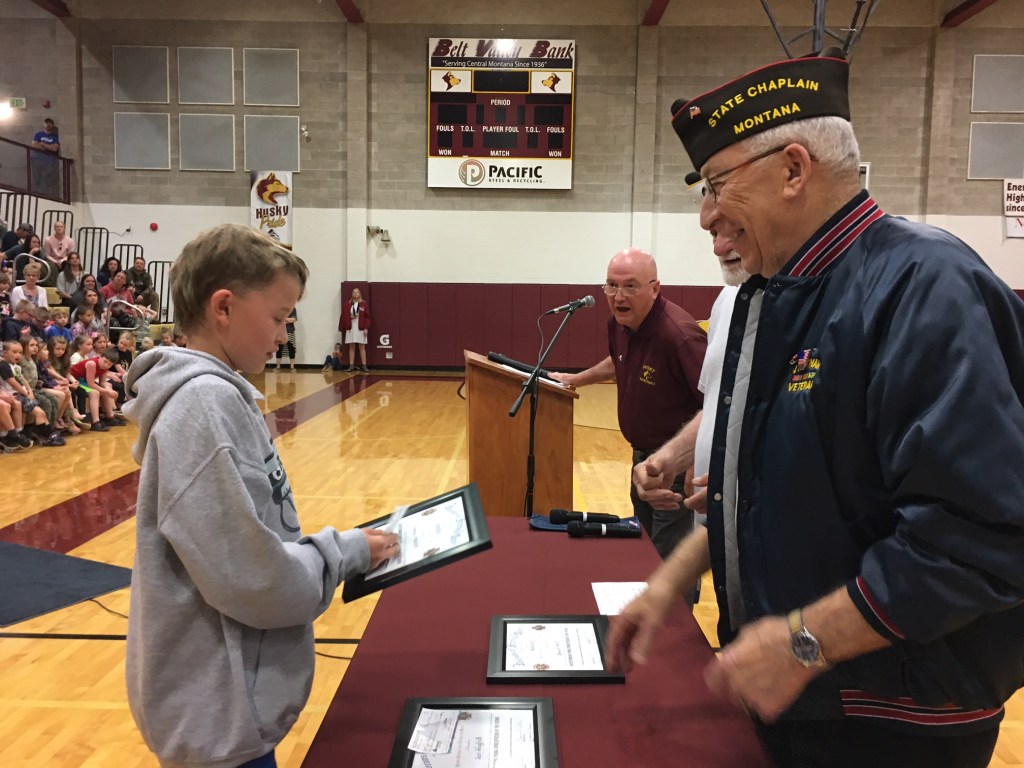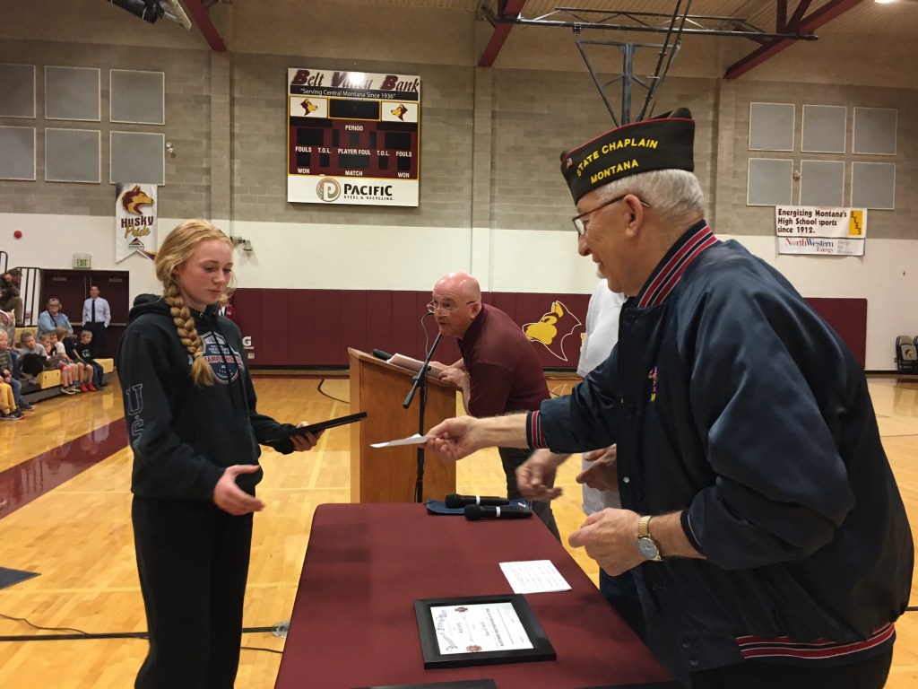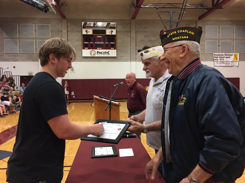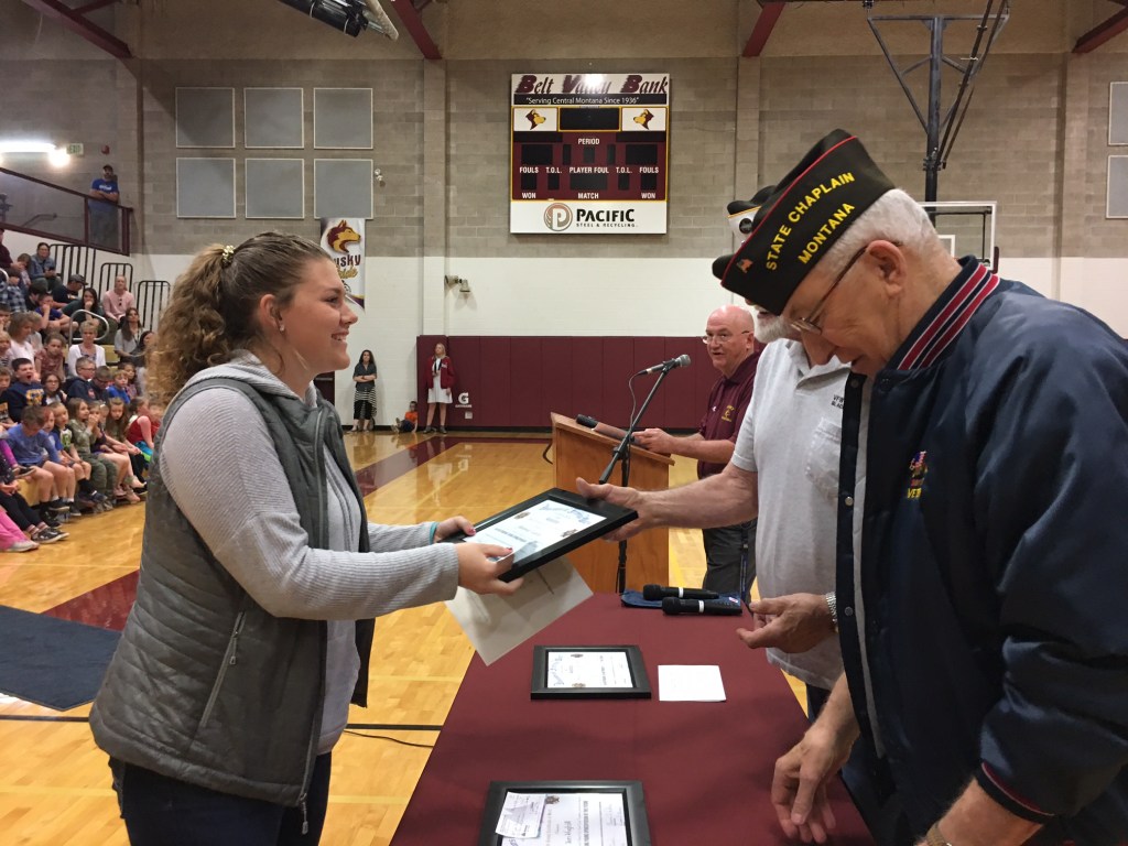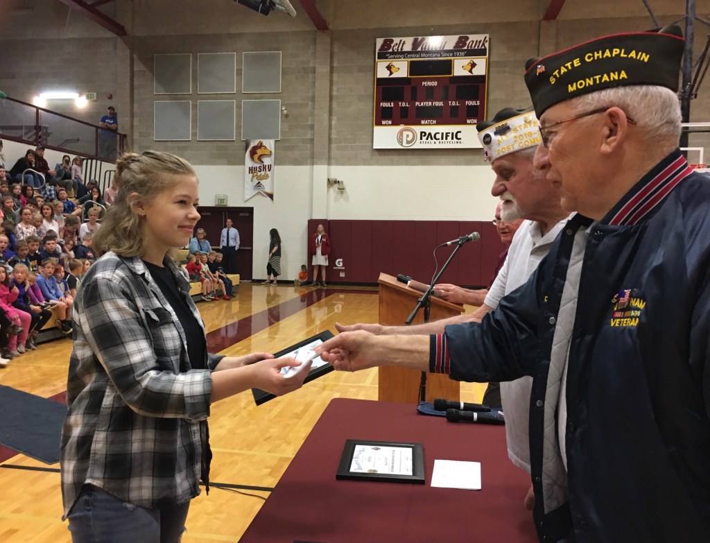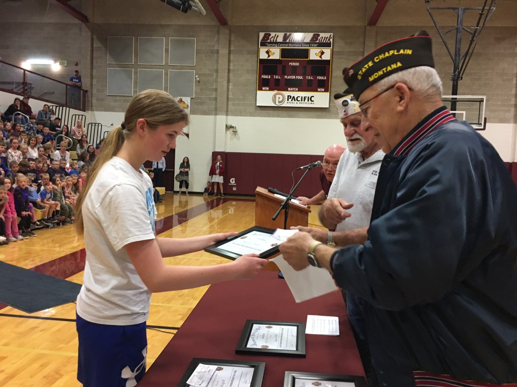 The Belt Middle School students that placed were: First Place winner Haidyn Visocan was awarded $100, Second Place winner Aizalyn Flaten was awarded $75 and Third Place winner Dawson Iverson was awarded $50. All were awarded certificates presented by Post Commander Frank Tuss and Post Chaplin Jim Porter.