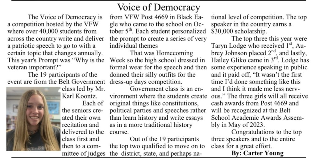 Students from Belt High School presented their speeches for the VFW’s Voice of Democracy contest on October 5th. The topic for 2022 – 2023 is ‘Why is the Veteran Important?’ Nineteen speeches were given, and many were very impressive. Many thanks to Belt High School teacher Karl Koontz for involving his students in the contest. First Place Winner: Taryn Lodge; Second Place Winner: Aubrey Johnson; Third Place Winner: Hailey Gliko. Thanks to all the participants!